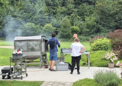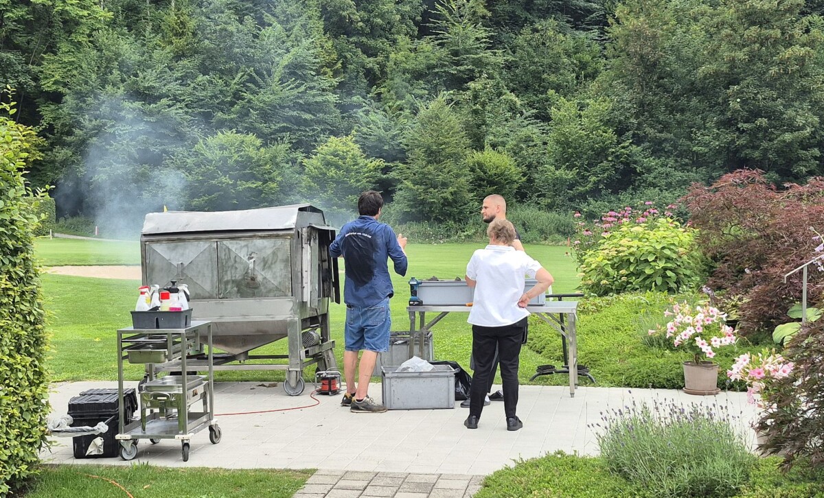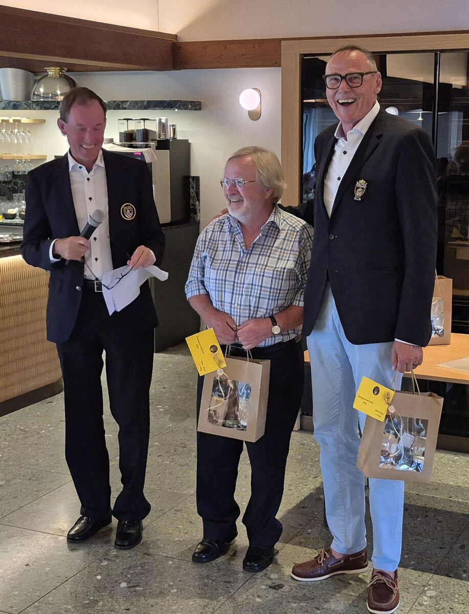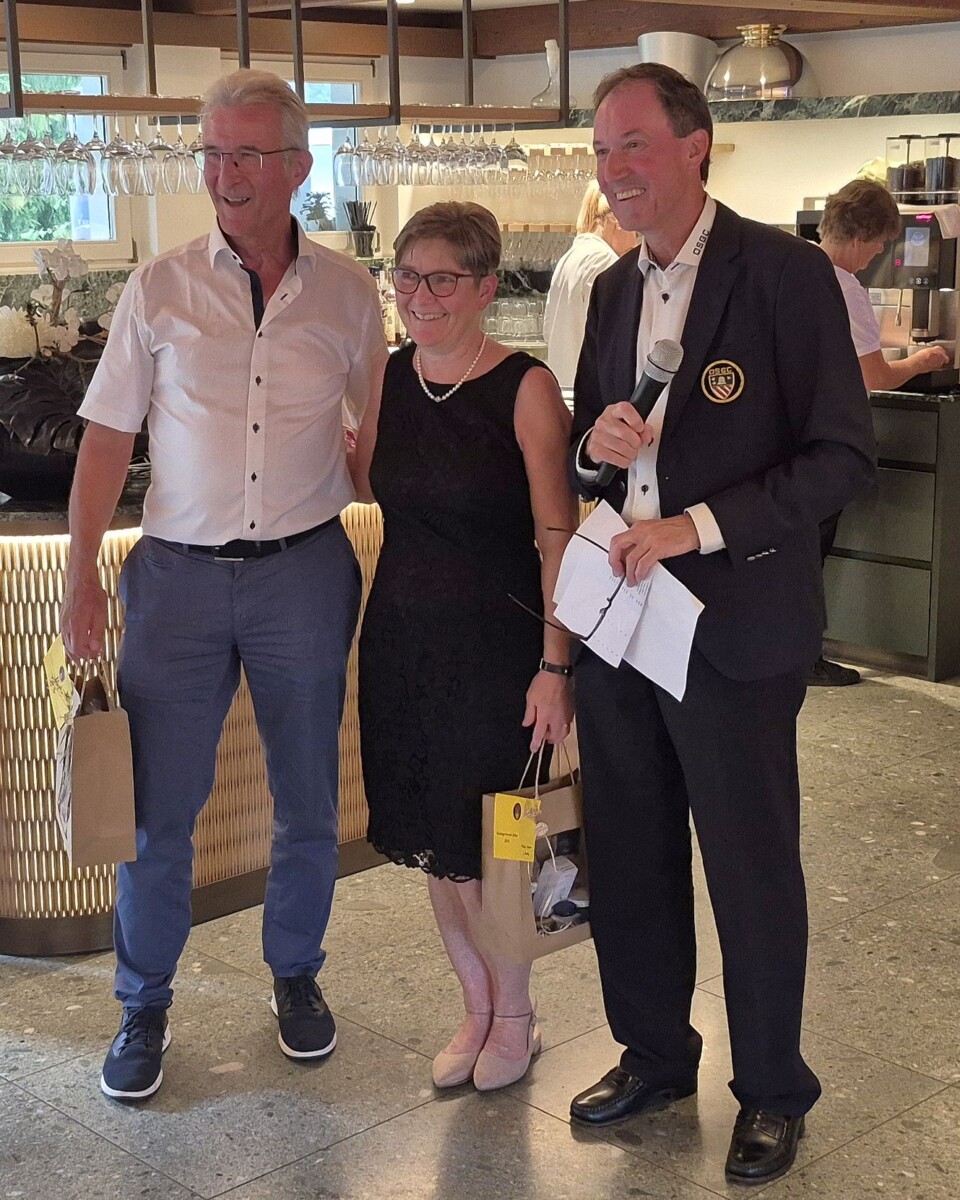 Leider ist nix mit stabilem Hochdruck-Wetter – der Sommer macht Pause. Heftige Winde, Regen und Gewitter führten schlussendlich zum Spielabbruch und es können 13 Loch des Four-Ball-Better-Ball Turnieres gewertet werden. Dafür erwartet die Gäste ein schöner Apéro und ein spezieller Gaumenschmaus danach. Die Stimmung der Teilnehmer – konstant im Hoch!