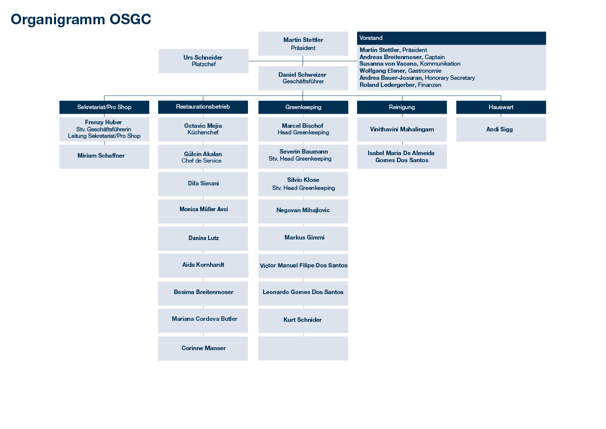 Golfclub Organigramm Leitbild Ethische Grundsätze Golfplatz Restaurant Geschichte Öffnungszeiten, Platzzustand, Wetter Wochenplan Organigramm OSGC 2026 zum ausdrucken